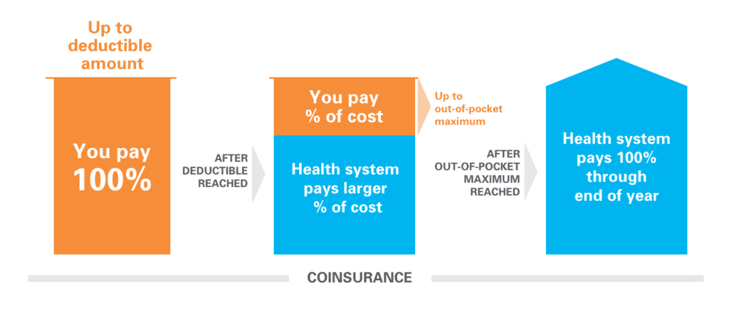 How it works: If your deductible is $1,500, you’ll pay 100% of eligible healthcare expenses until what you’ve paid adds up to $1,500. After that, you “met your deductible” and you share the cost with the health system by paying coinsurance for covered services and prescriptions.